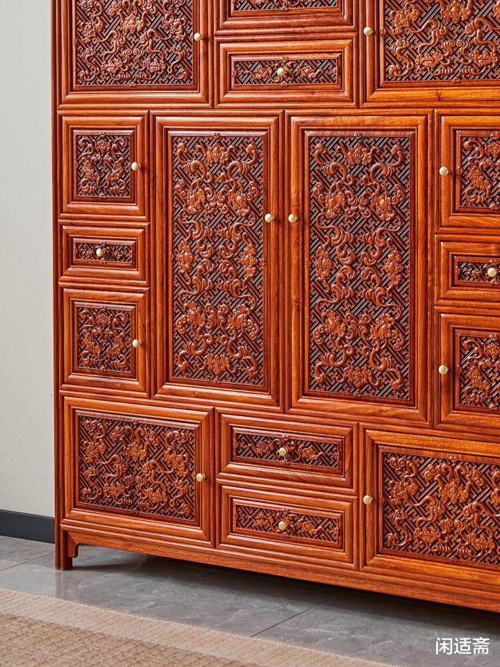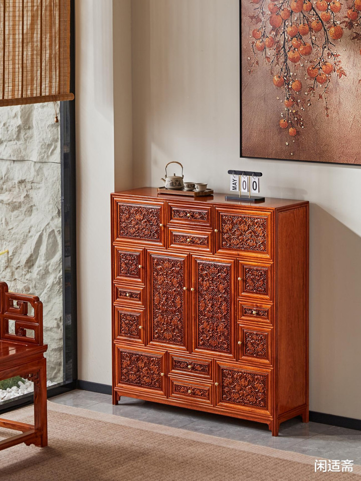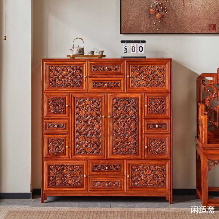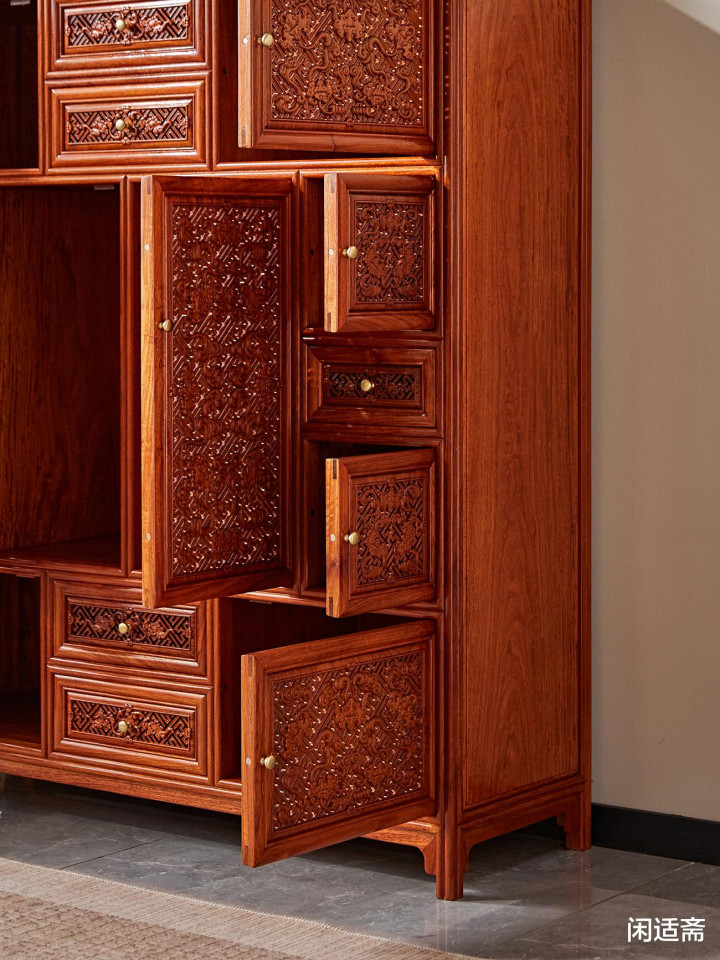 这款缅甸花梨蝠纹多宝阁万福柜,集珍贵材质、精湛雕工、吉祥寓意与实用功能于一体。无论是用于收纳藏品、陈设摆件,还是作为空间装饰,都能彰显主人的雅致品味与对美好生活的期许,是一款兼具使用价值与收藏潜力的中式古典家具佳作。