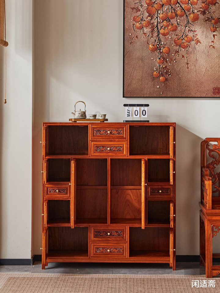 此款多宝柜选用优质缅甸花梨制作,木色温润醇厚,质地坚实致密,自带淡淡的檀木清香,安神静心。柜体内部空间划分合理,多宝阁的分层设计可根据藏品大小、类型灵活摆放古玩、雅瓷、玉器、古籍等藏品,让收纳更具条理;器型比例协调,大小适中,既能满足日常藏品收纳、摆件陈设的需求,又不会过分占用空间,适配客厅、书房、茶室等多种场景,无论是靠墙摆放还是居中陈设,都能自然融入空间,成为视觉亮点。